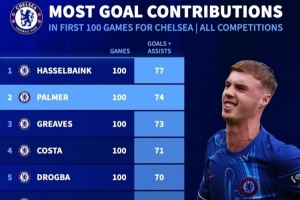 全文摘要:切尔西球员百场参与进球数据公布,帕尔默以74球位居队史第二,仅次于哈塞尔巴因克的77球。格里福斯(73球)、迭戈-科斯塔(71球)和德罗巴(70球)分列三至五位。该数据凸显了帕尔默高效的进攻贡献。
