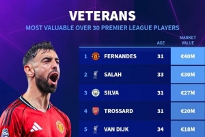 体育资讯12月13日讯 德国转会市场列出了英超年龄30+球员身价排名,B费居首,萨拉赫次席。