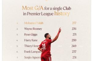 全文摘要:萨拉赫在社媒更新英超历史单一俱乐部参与进球榜,以277球超越鲁尼升至榜首。他周末的助攻助其刷新纪录,目前他已离队备战非洲杯。