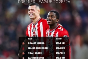 全文摘要:根据Stan Sport统计,本赛季英超跑动距离前三名中,扎卡以178.2公里位居榜首,诺亚·萨迪基位列第三,桑德兰包揽冠季军。埃利奥特·安德森以177.8公里紧随其后排名第二。
