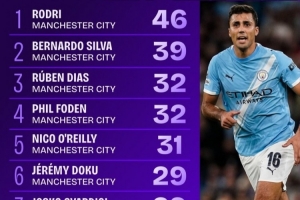 1、罗德里(曼城):46次