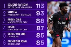 体育资讯9月19日讯 欧冠首轮今日全部战罢,据Squawka的数据统计,勒沃库森后卫塔普索巴完成113次传球,传球准确率93%,另外他是本轮唯一完成传球次数100+的球员。