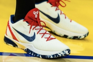 热身阶段,库里上脚科比6代美国队PE,美国国旗元素融入球鞋,清爽养眼。
