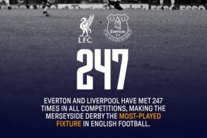 埃弗顿官方社媒晒出海报,确认埃弗顿与利物浦交手247次,是英格兰足坛交手次数最多的球队。